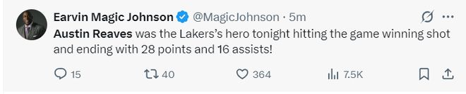 赛后魔术师评价这场比赛:里夫斯是这场比赛的英雄,他不仅拿到28分16助攻还命中了绝杀一球。